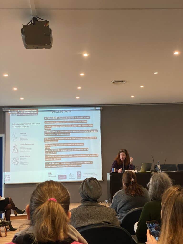 Mme Alice CARPENTIER, Déléguée aux droits des femmes auprès de la Préfète de l’Essonne, a présenté le label LEAO (Lieu d’Écoute, d’Accueil et d’Orientation), une porte d’entrée unique pour les victimes de violences conjugales.