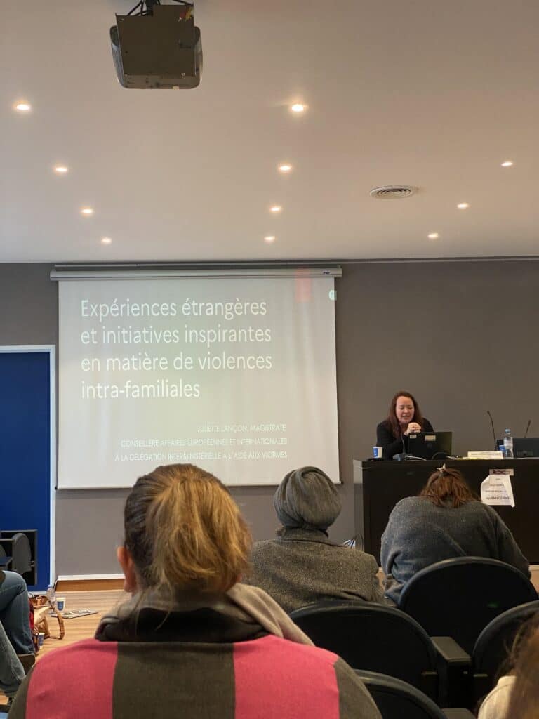 Mme Juliette LANÇON, magistrate et conseillère à la Délégation interministérielle à l’aide aux victimes, a présenté plusieurs initiatives étrangères, notamment au Québec.